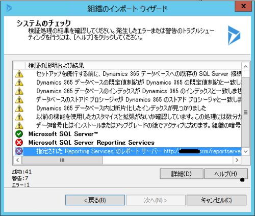 Dynamics365の組織インポートを行おうとしたところ、システムのチェックにて掲題のエラーに遭遇。 指定された Reporting Services のレポート サーバー http://xxx-crm/reportserver を検証できませんでした。エラー: オブジェクト参照がオブジェクト インス…